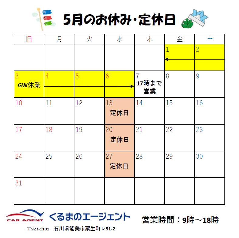 5月の営業スケジュールのお知らせです!